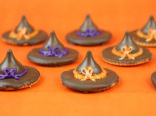 3. Unwrap chocolate Kisses® and place one kiss in the middle of each chocolate coated cracker, before coating has set.