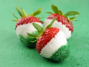 4. Before coating is set, dip about 1/3 of each strawberry in green sugar decors and place on wax paper to dry.