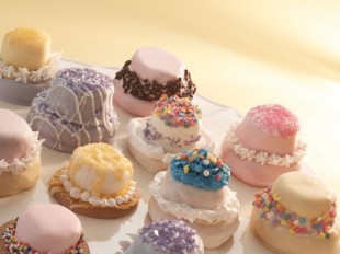 Suggestions: Pipe ribbon of icing for hatband, add bow design, create dots and flowers on bonnets, decorate with sprinkles.