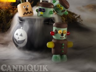 1. Melt Vanilla CANDIQUIK® Coating in Melt and Make Microwaveable Tray™ according to directions on package. Add green food coloring (oil or powder based!) to create green coating. Dip 12 marshmallows, one at a time and set on wax paper (heads). Use small assorted candies as a nose and eyes (place on marshmallow before the coating dries).