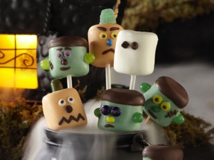 4. Create faces with assorted candies and decorative icing (attach eyes/nose to CANDIQUIK® before completely dry). For Frankenstein: dip the top 1/4 of the marshmallow in Chocolate CANDIQUIK®.