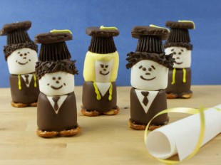 3. Dip the top (1/2 inch) of another marshmallow in Chocolate CANDIQUIK® and sprinkle with brown sprinkles (or mini chocolate chips) to create “hair”. Place on wax paper to set. Decorate the face and gown of each graduate using a toothpick dipped in Chocolate CANDIQUIK®.