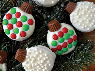 3. Before coating sets, attach a miniature PB Cup on top of Oreo® as ornament topper. Decorate as desired.