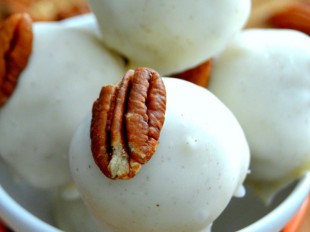 5. Stir cinnamon into melted CANDIQUIK® Coating. Gently coat each truffle using a fork, and place on prepared cookie sheet to set. Immediately top each truffle with a pecan half and allow coating shell to harden before serving.