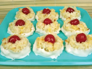 5. Preheat oven to 350°F and scoop macaroon mixture by the tablespoonful onto a parchment paper lined baking sheet. Make a small indent on the top of each macaroon and gently press a maraschino cherry in the indentation. Bake for 15-20 minutes.