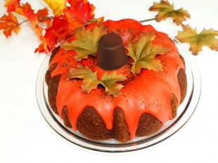 6. Pour orange-colored CANDIQUIK® Coating over the pumpkin cake, smoothing over the edges.