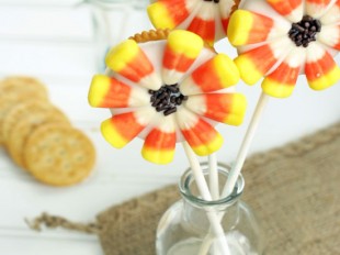 5. Arrange 8 candy corns on the outside of each cracker before coat has dried. Sprinkle the center with brown jimmies. Let dry.