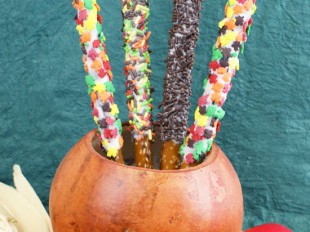 3. Sprinkle pretzel rods with assorted sprinkles.