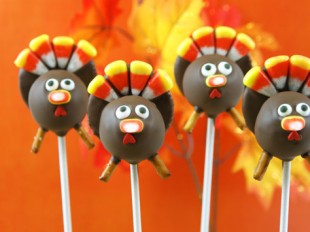 8. Before cake pop is completely dry, press and hold the chocolate coated cracker against the back of the turkey until set. Place in Styrofoam block to dry.