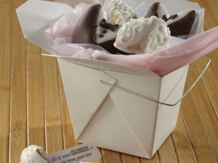 4. Dip half of the fortune cookies in melted Chocolate CANDIQUIK® Coating in a “V” shape; place on wax paper until set.